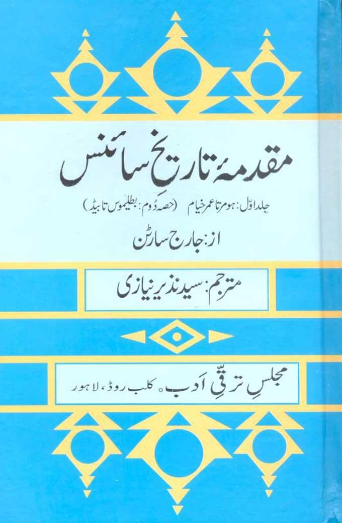 سائنس کی تاریخ میں جارج سارٹن کی ایک خاص اہمیت ہے اور اس کا سب سے زیادہ اثرانگیز کام سائنس کی تاریخ کا تعارف (Introduction to the History of Science) تھا جو تین جلدوں اور 4296 صفحات پر مشتمل ہے۔ پہلی جلد (والیم وَن) میں ہومر تا عمر خیام کے دور کا مطالعہ کیا گیا ہے۔ سیّد نذیر نیازی نے اس کتاب کی پہلی جلد کا اُردو میں ترجمہ کیا ہے۔ مترجم نے اس جلد اوّل کو تین حصوں میں تقسیم کر کے ترجمہ کیا ہے۔ پہلا حصہ پہلے باب سے چودہویں باب (کل چودہ ابواب) پر مشتمل ہے، جس میں یونانی اور عبرانی علوم کے آغاز (نویں اور آٹھویں صدی قبل از مسیح) تا رومی لکھاری پلنے دی ایلڈر (پہلی صدی عیسوی کا دوسرا نصف) کے دور کا احاطہ کیا گیا ہے اور یہ پہلے باب سے چودھویں باب (کل چودہ ابواب) پر مشتمل ہے۔ دوسرے حصے میں بطلیموس (دوسری صدی عیسوی کا پہلا نصف) تا بیڈ (آٹھویں صدی عیسوی کا پہلا نصف) کے دور کا احاطہ کیا گیا ہے اور یہ پندرہویں باب سے ستائیسویں باب (کل تیرہ ابواب) پر مشتمل ہے۔ تیسرے حصے میں جابر بن حیان (آٹھویں صدی عیسوی کا دوسرا نصف) تا عمر خیام (گیارہویں صدی عیسوی کا دوسرا نصف) کے دور کا احاطہ کیا گیا ہے اور یہ اٹھائیسویں باب تا چونتیسویں باب (سات ابواب) پر مشتمل ہے۔ زیرِ نظر اُردو ترجمہ مقدمہ تاریخِ سائنس کی جلد اوّل (ہومر تا عمر خیام) کے حصہ دوم: بطلیموس تا بیڈ پر مشتمل ہے۔